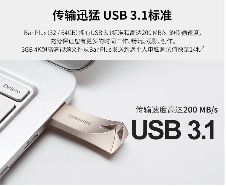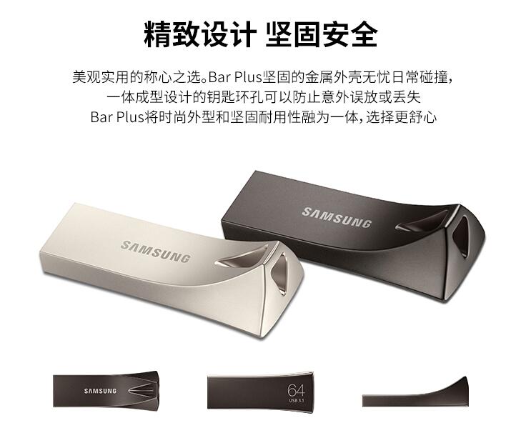 三星優(yōu)盤(pán)64GB USB3.1 U盤(pán) BAR升級(jí)版+高速汽車載歌曲金屬外殼精致